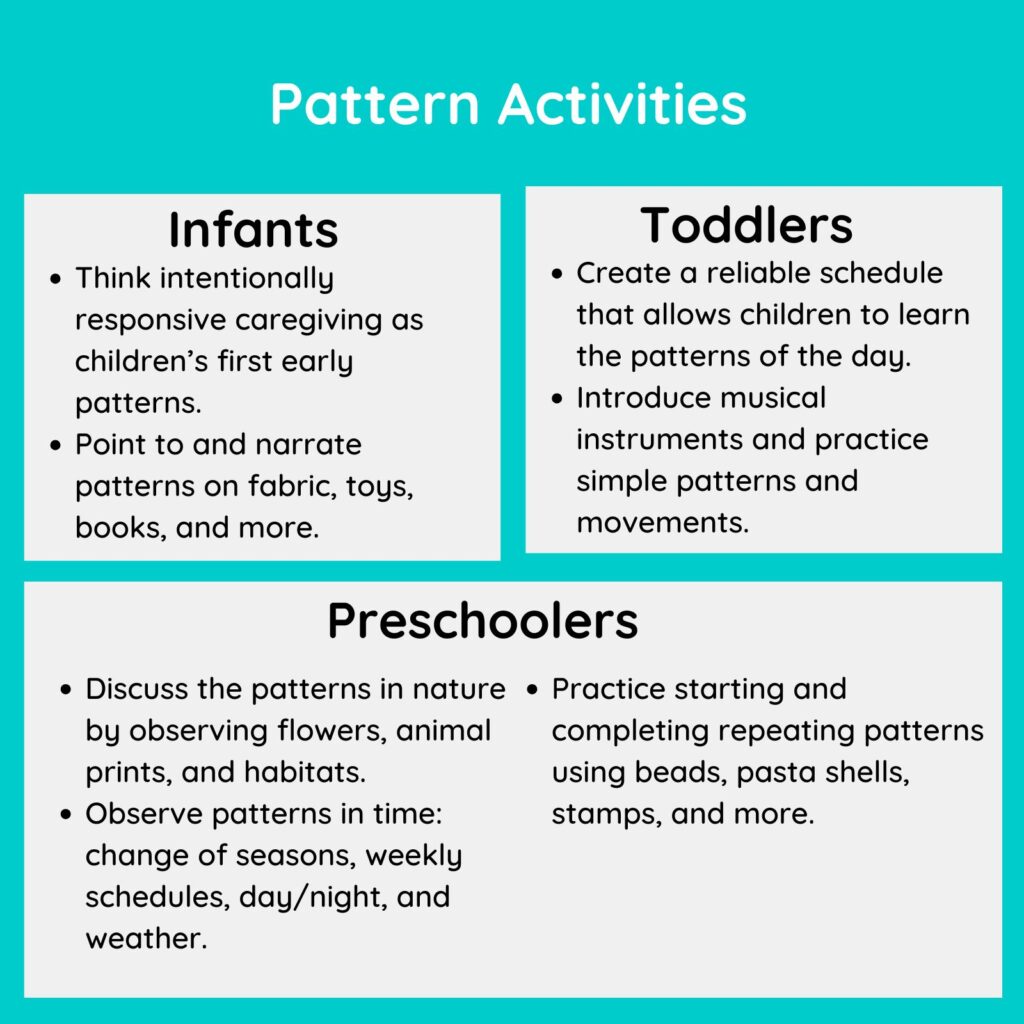 In the infant years, the most important patterns for young children are patterns of safety and healthy routines. For example, when they cry and receive love from a caring adult, it helps them to understand the connections between emotional reactions to responsive support. It is important for young children to have predictable routines as it allows children to understand what is expected of them at specific times of day, and they can feel secure in knowing when they will be fed, changed, bathed, dressed, and read to. In the toddler years, educators and caregivers can also introduce the topic of patterns through music and movement, as that is the most age-appropriate way to invite children’s participation. They can invite children to finish the lyrics of favorite songs, or to repeat patterns with homemade musical instructions from our 5 Senses theme, “Hearing: Rhythmic Instruments”. With simple homemade drums and shakers, children can participate in fun patterns that are fast and slow, loud and quiet, or that shake three times and then just once.